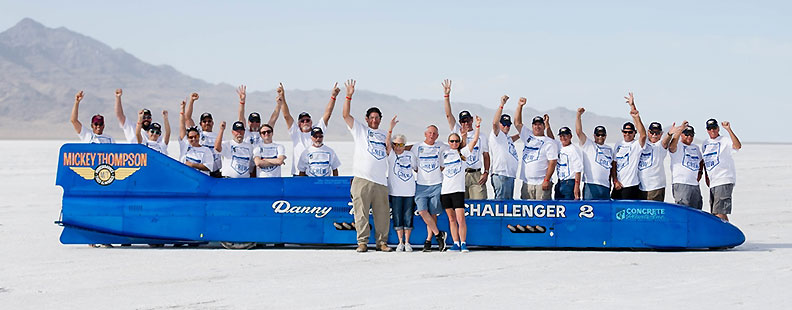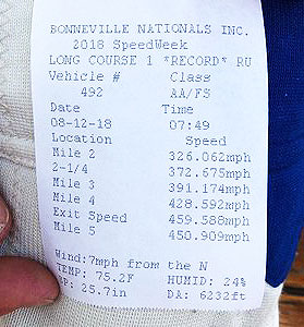 The Challenger 2 Team and their streamliner at Bonneville after setting the AA/FS National Record. In the front row, second from right is owner/driver, Danny Thompson. The time slip for the last run is below right. Images: Thompson LSR
