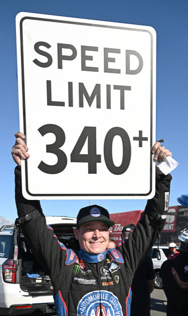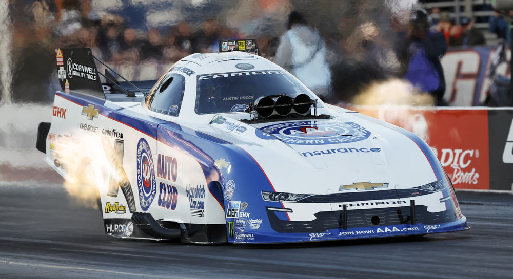 November 2024 at the NHRA In-n-Out Burger Finals. Austin Prock is on his way to a stunning 3.828-341.68 in the first round of eliminations in the BME-equipped Auto Club Chevrolet. Prock would be the Funny Car runner-up in the event and the 2024 FC Champion. Image: NHRA