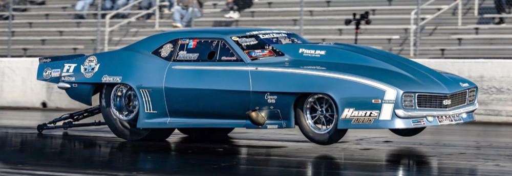 The engine in Micke's car is a 5200 horsepower, Proline Racing-built, 564-inch hemi with two Harts, 88-mm turbos. Mark relies on the strength and reliability of Bill Miller Engineering Forged Aluminum Connecting Rods as well as BME Pistons and Wrist Pins to get his gorgeous blue first-gen Camaro down the eighth consistently in the mid-threes at 220 miles an hour.