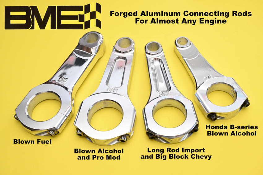 Standard BME Forged Aluminum Connecting Rods for most Chevrolet, MoPar, and Pontiac V8s are reliable replacements for stock, forged steel connecting rods in engines of up to 1000 horsepower. Aluminum Rods for some Ford V8s of similar power output are available on special order. A Big-Block Chevrolet style aluminum rod BME makes for Pro Stock drag racing is, good for 1500-hp, is also available. If the application is a Chrysler 426 Hemi or big-block wedge, BME's blown-alcohol rods can be used at levels over 4000-hp with outstanding reliability/durability.