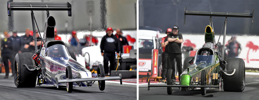 The Chesleigh Motorsports (left) and the Darien & Grisel Racing (right) BME-equipped dragsters run as NHRA Top Alcohol Dragsters but are unblown on fuel. Image: Auto Imagery