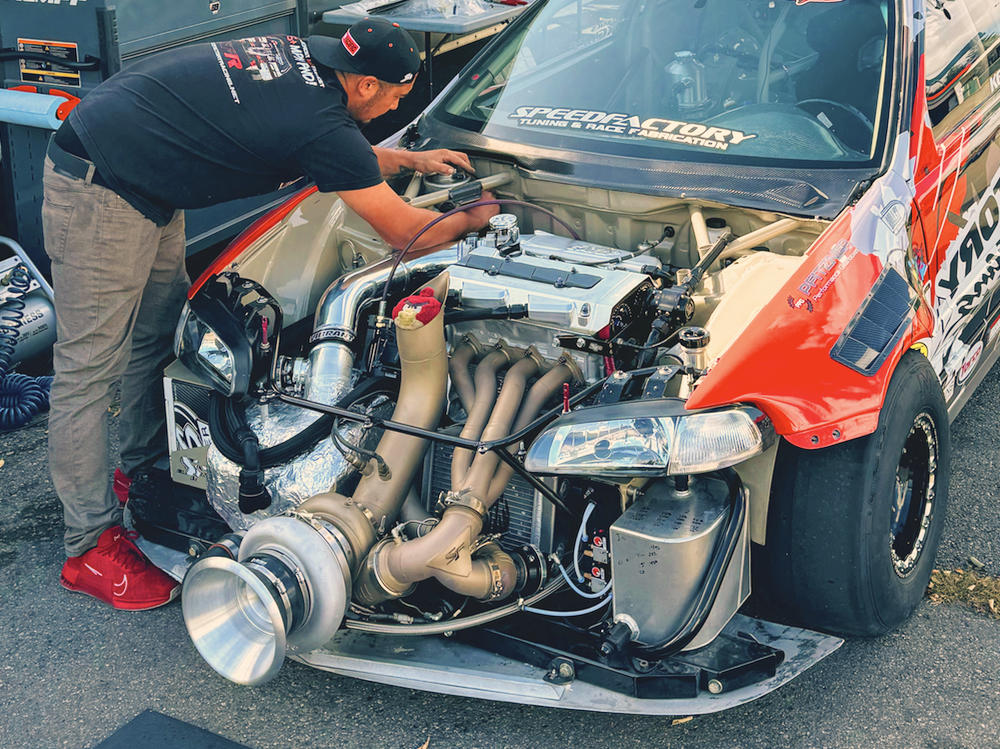 Team Co-Owner and Engine Builder, Kevin Kempf works on SpeedFactory Racing's BME-equipped, 2300-horsepower Honda Civic. Image: SpeedFactory Racing