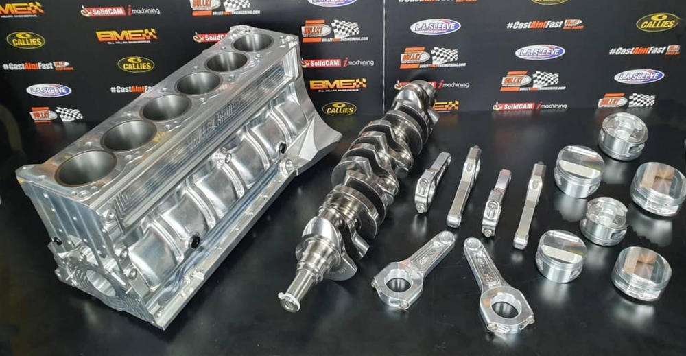 A Bullet Race Engineering Nissan RB30 Extreme billet aluminum block supports up to 3000-hp and is available with BME Pistons, Connecting Rods, and Wrist Pins along with a Calles Crankshaft. Image: Bullet Race Engineering