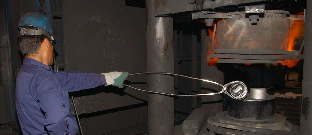 Bill Miller Engineering contracts with Aluminum Precision Products, a specialty foundry in Santa Ana, California for its piston and connecting rod forgings. Shown here is an APP working removing a BME 2618 aluminum piston forging. At right, waiting for the forge to cycle is a section of 2618 bar stock. The forging die is inside the flaming upper part of the forge. The temperature is 800°F. The forge applies 18,000 tons of pressure. Image: BME